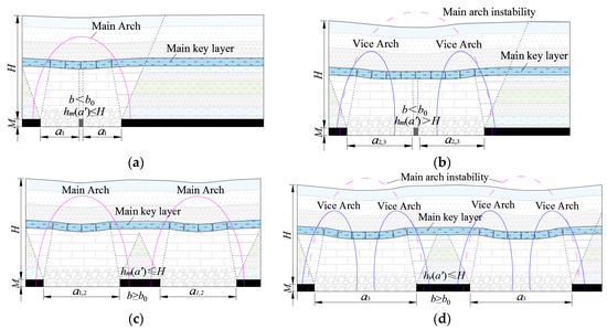Figure 13. Working face adjacent mining overlying strata “arch–beam” structure model. (a) single main arch + “V-shaped” beam; (b) double vice arch + “U-shaped” beam; (c) double main arch + “W-shaped” beam; (d) four vice arches + double “U-shaped” beams. - For mining width a3, the overlying strata has a vice arch structure. When the width of the interval coal pillar b < b0, then the coal pillar is a failure, and the overlying strata structure on both sides of the working face is connected to form the structure of the double vice arch + “U-shaped” beam. At this time, there is no obvious stress concentration in the center of the goaf, and only several original rock stress recovery areas appear, as shown in Figure 13b. When the width of the interval coal pillar b ≥ b0, then the coal pillar is stable, separated from the goaf on both sides, and a double arch foot is formed above the coal pillar (the arch foot is shared when the coal pillar is small). There are vice arches on both sides of the coal wall, forming a structure of four vice arches + double “U-shaped” beams, as shown in Figure 13d.