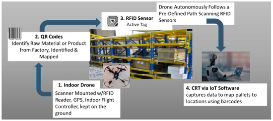 The scanner-mounted “indoor” drone with RFID reader is enhanced with barcodes or Quick Response (QR) codes, which can store more data than normal barcodes. The latter can identify raw material or products from the factory and map the results. However, QR codes require a dust-free environment, which is hard to find at construction sites. The use of RFID to identify objects is a turning point in inventory control, as RFID uses radio waves to communicate between a tag on the product and the reader. When a shipment arrives, an RFID tag can be attached, and smart sensors are used to identify the objects on the rack using an electromagnetic signal to transmit the information to a central database where they are analyzed—by warehouse management software.