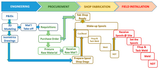 To help illustrate the proposed drone-based model, a typical pipe spool fabrication activity for an oil and gas megaproject is examined as a case study. Installation of large pipe spools is normally an integral part of any process plant construction. Most industrial projects have complex process piping that requires engineering, procurement of raw material, and then shop fabrication to fit it before it is installed and tested in the field. The pipe spool fabrication shops are usually located either inside or in the vicinity of the industrial projects. The associated ‘cut and weld’ activities are always critical, contributing to major delays or rework. Pipe installation accounts for 45% of the cost of plant construction [29]. The prefabricated components of a piping system are called spools, and they include the pipes, flanges, and fittings, and are assembled in a fabrication shop near the project site. Normally, designers show the location of field welds on isometric drawings, but the pipe manufacturing contractor makes pipe spool drawings based on the field welds. A process plant comprises hundreds of steps involving thousands of pipe spools connected and welded to fittings, flanges, gaskets, and fasteners, cut into required lengths and pre-assembled at the fabrication shop near the jobsite. The spools must be fabricated in the required installation sequence and delivered in time to avoid slippage. These are recognized as critical processes, and contractors require a substantial backlog of fabricated spools before they can start actual piping installations.