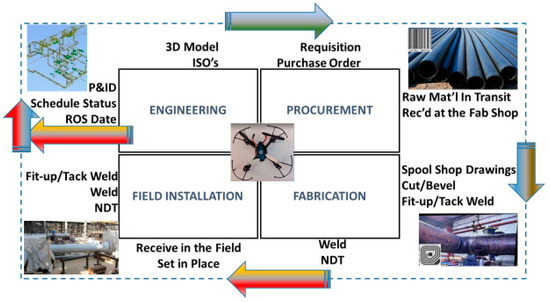 The proposed model in Figure 5 shows the improved process for pipe spool monitoring that starts in the engineering phase and continues throughout the procurement, fabrication, and field installation, with drones playing a vital role throughout this process. Drones can capture the status of P&IDs and schedule milestones when the raw material is required on site and follow the status of 3D model and material requisitions. As spool isometrics are prepared from the isometric drawings, the isometrics for each work area or work package are tagged with barcodes. Every welding detail is marked on the spool isometric drawings. The material requisition to procure the raw material is given a reference number, and as the PO is issued and the pipe is manufactured and shipped, each pipe or flange, etc., is given a barcode. The barcode shows pipe material, diameter, length, and plant location. The information regarding the MTO, Purchase Requisitions (PR), Purchase Order (PO), vendor status, and expediting actions are all pulled using RFID/IoT technology. This close monitoring continues end-to-end until the material is shown in transit or is received at the fabrication shop. The model is a two-way communication as it not only pulls and extracts data, but also provides information to update the 3D model and isometric drawings to pictorially show what spools have been fabricated, welded, or released to site. Drones can identify and update the spool fabrication process as they pass through the various gates.