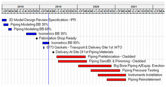 The schedule in Figure 6 was extracted from a primary critical path schedule using an actual project through the engineering, pre-fabrication, and pipe installation phases. Before piping prefabrication starts, fittings and gaskets (as reflected in the MTO) should have been delivered and piping isometrics issued so that piping spool drawings are prepared. The piping spool prefabrication duration at times takes several months, depending on the project. Contractors allow large buffers of pipe spools before starting field installation in order to have enough work fronts. In general, contractors do not start piping installation until they have over 50% of the spools prefabricated [32].