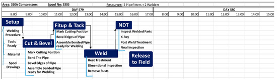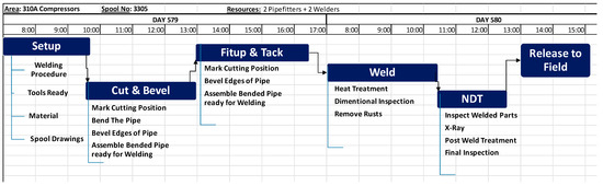 Spool fabrication planning is best done by the shop supervisor who controls the sequence and resources and is fully aware of material and resource availability. Planning follows a rolling two-week look-ahead schedule, as shown in Figure 7, which represents the fabrication of one spool. Usually, a fabrication shop is set up to process several spools simultaneously. This schedule shows the detailed plan to produce every spool that is required for each area or major equipment. The look-ahead window provides an overview of the activities that will take place in the next two weeks, which gives adequate time to ensure that everything is ready in terms of material and resources.