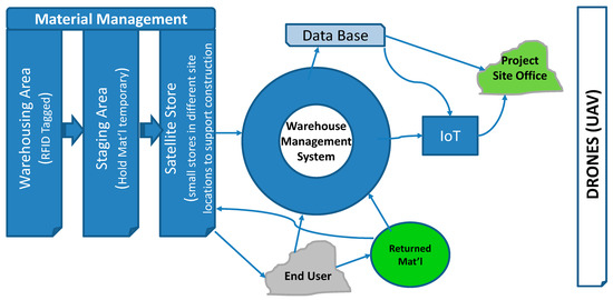 Capital projects are complex and generate enormous amounts of documents, most of which are not retained or archived for future reference or use. The commercial use of drones has been deftly enhanced and automated. Drones are now increasingly dependable, affordable, fully autonomous, and highly accurate in image recognition. Their induction, combined with IoT, minimizes the use of bar-codes and RFID scanners for inventory management, leading to improved inventory accuracy. Using IoT technology, drones can both gather and receive information. An IoT system consists of sensors and devices that communicate to the cloud data storage through connectivity software that gives instructions to perform an action. A sensor provides feedback on a process or element in a measurable manner. IoT technology provides drones with the capability to perform operations from any device connected to the internet. IoT technologies and AI can power the drones, augmented with RFID, sensors, and robots, to perform real-time analysis, providing the intelligence in site warehouse automation to fly autonomously while carrying payloads, avoiding obstacles, and navigating indoors with accuracy.