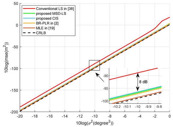 In Figure 3, we demonstrate the MSE of different 3-D AOA methods versus the variance in the angle measurement noise. All parameters and results are shown in dB. For comparison, we consider the conventional LS in [42], MLE in [19], and BR-PLE in [2]. increases from dB to 0 dB. The MLE is almost identical to the CRLB, which is in accordance with general knowledge. Furthermore, the proposed CIS and MSD-LS methods have similar performance as BR-PLE in [2] and are able to approach the CRLB with all angle variances. In addition, compared with LS, both of the proposed methods have a gain of about 8 db. More importantly, referring to Section 4, the proposed CIS and MSD-LS methods have much less computational complexity than BR-PLE and MLE.
