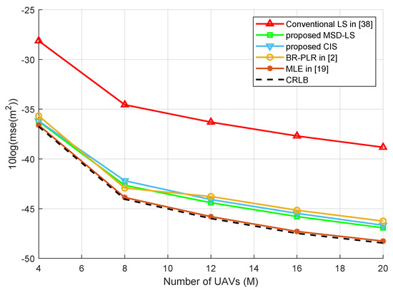 Figure 4 shows the MSE over the number of UAVs using different 3-D AOA methods. UAVs are randomly distributed in space. It can be seen that both of the proposed methods also have a gain of about 8 db over LS, and they have similar performance as BR-PLE in [2], and even better in certain cases. This may be because of the configuration of multiple UAV networks. An insightful observation is that the performance differences in all these methods have similar values. Especially when the number of UAVs becomes small, all of the methods approach the CRLB’s performance. To sum up, the proposed CIS and MSD-LS methods have a satisfactory performance with less computational complexity.