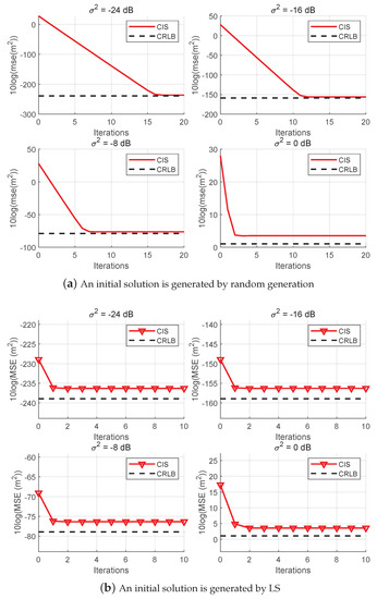 The MSE of the CIS method versus the number of iterations with different noise levels is plotted in Figure 5, where a random generator and conventional LS are adopted to generate an initial value in Figure 5a,b, respectively. It can be seen that CIS is convergent with any initial values in Figure 5a. Furthermore, the convergence speed is about 16.5 dB per iteration. Thus, as noise decreases, the convergence speed becomes faster. Observing Figure 5b, we find that two or three iterations are enough when LS is used. In this case, the computational complexity is about , which is faster when noise is very low. According to Table 2, when the number of iterations is greater than four, it is better to adopt LS to generate an initial solution. Therefore, random generators can be replaced by conventional LS to generate an initial value in low-noise regions. To sum up, the highest computational complexity of CIS is about , which is still lower than BR-PLE in [2].