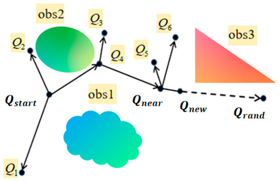 If there exists a potential collision between and the parent node , the path will be abandoned, and a new node will be generated. The loop continues until the distance between and the is less than , where is used to judge whether it is close enough to the target point or reaches the target point. Figure 2 shows the schematic diagram of the RRT algorithm.