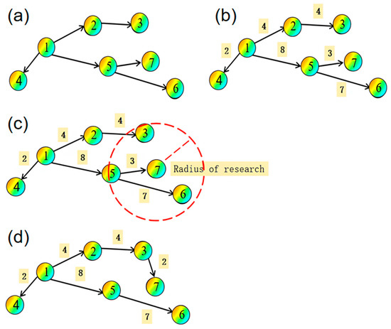 Resetting parent node and rerouting process of the RRT* algorithm. (a) Extended random tree; (b) assign weights to the tree; (c) reselect the parent node; (d) reconnect the nodes.