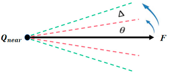 In the RRT* algorithm, the sampling mechanism of the algorithm itself has not changed, and the problem of slow convergence still exists. Therefore, the angle-increasing sampling method is introduced based on the RRT algorithm. It is to retain the original random sampling of the whole map, give a constraint to the search scope, and limit the initial search scope to a particular angle space. Figure 5 shows the basic principle of this method, taking the direction of the resultant force F of as the starting axis, counterclockwise as the positive direction, the initial angle , and the increment .