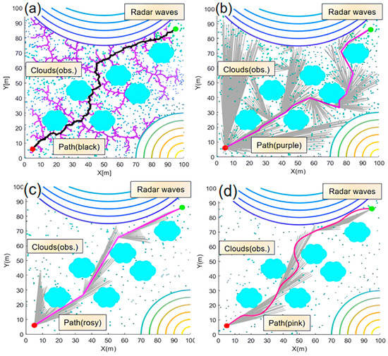 The algorithm in this paper is simulated with MATLAB 2022(b) software in the Window11 system environment. The hardware configuration of the experimental platform is CPU i9-10980XE, GPURTX2080Ti, memory 128GB. First, establish a simulation map and set parameters: the starting point coordinates are (5, 6), the target point coordinates are (95, 86), the fixed search step is 0.5, the attractive coefficient = 1, the repulsive coefficient = 5, the obstacle influence range , the initial value of the sampling range , the maximum number of samples COUNT_ MAX = 30,000, and the adaptive coefficient K = 2.81. The time, heading angles, angle of deflection, and of the obtained path are compared in the given constraint range . In this map, color ripples represent the interference source, blue clouds represent cloud obstacles, red is the starting point, and green is the target point. The final paths obtained by the four algorithms are represented by black (Figure 8a), purple (Figure 8b), rose (Figure 8c), and pink (Figure 8d), respectively.