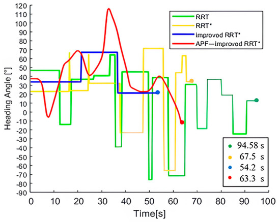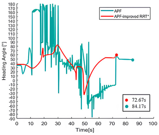 It is apparent from Table 2 that the heading angle of the APF algorithm has a long time and large amplitude oscillation, and the angle close to 160° makes it impossible for the UAV to operate in the virtual environment. In addition, although the APF-IRRT* algorithm is not stable in the static environment under the dynamic environment, and the heading angle changes in several cases, the maximum turning angle is only 23.94°, which is acceptable. The required time is 72.67 s, which is only 13.67% shorter than the APF algorithm, but the smoothness is improved by 85.03%. The fused APF-IRRT* algorithm also performs well in a dynamic environment.