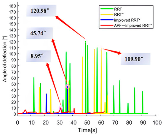 From the above figures, it can be observed intuitively in Figure 8b that the RRT* algorithm fared better than the traditional RRT algorithm, but it is still far from the UAV flight requirement. As is glaringly revealed in Figure 8c, the IRRT* algorithm has the most petite inflection point; meanwhile, the instantaneous turning angle is too large and still exists. However, it seems to appear more concise because of constraints on search range. The fused APF-IRRT* algorithm in Figure 8d is optimal in terms of path smoothness, with no inflection point, continuous angle, and smooth path. The charts of heading angle change and deflection angle change of the four algorithms are displayed in Figure 9 and Figure 10.
