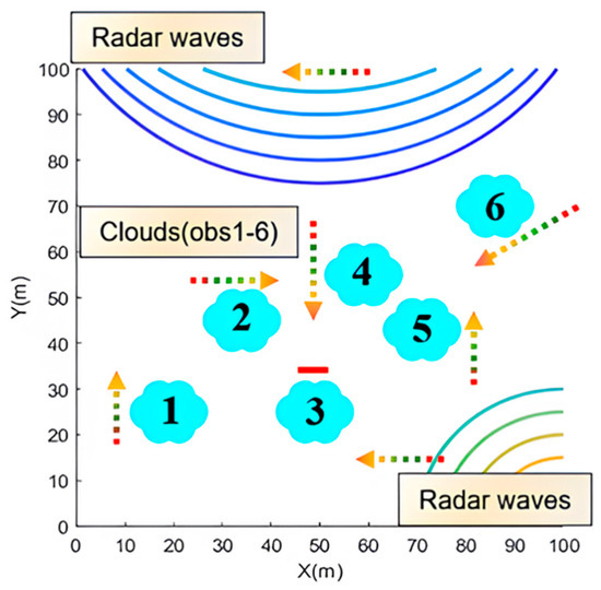 Because of the complexity of the actual disaster environment, the offline planning of UAVs often cannot safely reach the terminal for rescue, so the dynamic online path planning of the algorithm is essential. In the above-simulated map environment, when all parameters remain unchanged, different speeds and directions (random speeds and fixed directions) are assigned to each obstacle, which can more closely simulate the rapidly changing battlefield environment and more effectively test the reliability of the algorithm. Figure 11 depicts the moving direction of each obstacle.