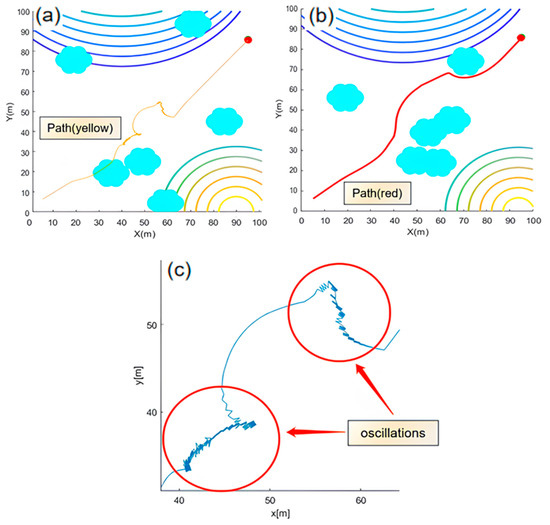 Comparison of online planning paths. (a) the APF algorithm (b) the APF-IRRT* fusion algorithm (c) Oscillation graph of the APF algorithm.