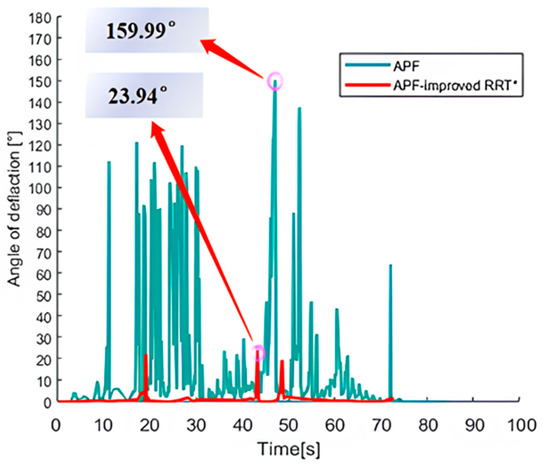 Judging from the above two figures, it is interesting to recognize that in a dynamic environment, when the APF algorithm encounters a moving obstacle, it falls into a local minimum and generates oscillation, as shown in Figure 12c, which significantly affects the safety and reliability of UAV flight. In contrast, the path obtained by the APF-IRRT* algorithm is relatively smooth and stable. The charts of heading angle change and deflection angle change of the two algorithms are presented in Figure 13 and Figure 14.