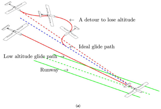 Another set of simulation results is shown in Figure 14. The aircraft started from a point (0 m, 50 m, ) with the heading angle 0 rad, where the initial altitudes were 36∼48 m with an interval 3 m. Furthermore, the target touchdown point was (600 m, 0 m, 0 m). The results show that if the initial altitude of the aircraft was too high to land directly, the planner would guide the aircraft to lose altitude, and if the initial altitude of the aircraft was appropriate to the heuristic distance, the planner would guide the aircraft to land directly.