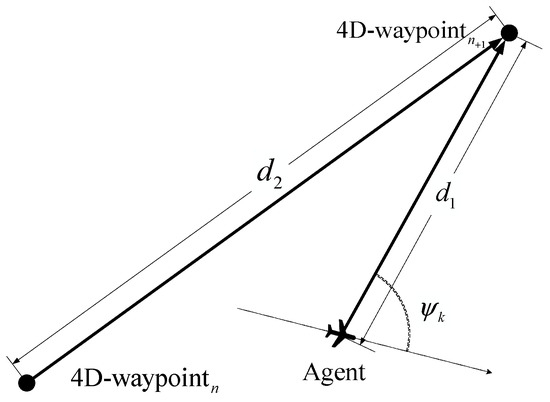 where , , and , respectively, represent the status information of the drone itself, the pre-defined strategic trajectory temporal information, and the threat status information of the nearest target in each sector. In addition, and denote the heading angle and the velocity of the drone at time , respectively. If the drone is currently between waypoint and waypoint , we use to denote the estimated time of arrival (ETA) when the drone arrives at waypoint , to denote the current coordinated universal time, and to represent the temporal difference between the pre-defined time of arrival at waypoints n and n + 1 in the pre-determined 4D trajectory. If and denote the distance between the current position of the drone and waypoint and the distance between waypoints and , respectively, as shown in Figure 6, then, and can be expressed as