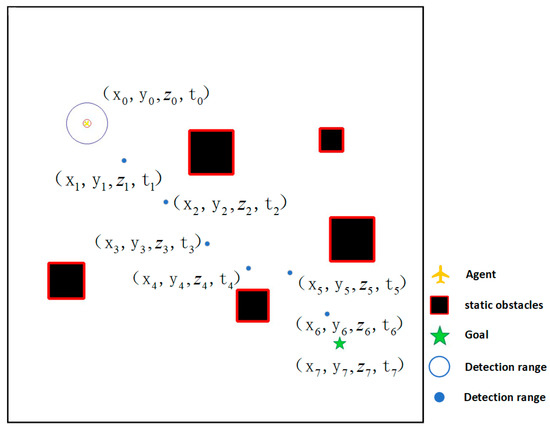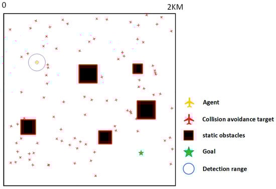 In this paper, it is assumed that the detection range of a drone is a circle with the drone’s geometric center as its center and a radius of 100 m, and that the drone can obtain the information for all non-cooperative targets within this range. Specifically, considering the pre-defined four-dimensional waypoint constraints at the strategic level, the state space at time in this paper consists of three parts expressed as: