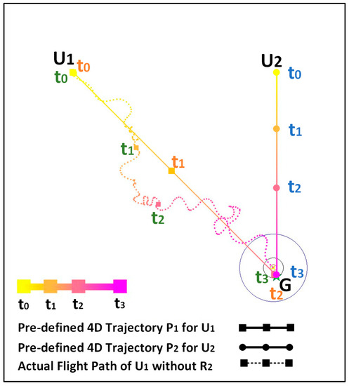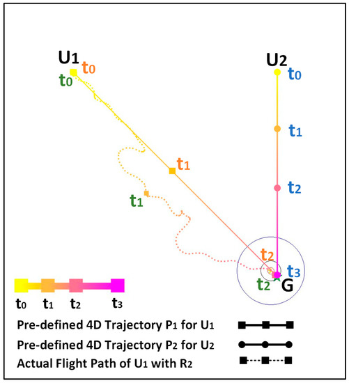 In terms of application, FAA and Eurocontrol [21] have continuously tried to implement air traffic management based on 4D trajectories. The SESAR Horizon project organized by Eurocontrol has viewed trajectory management and 4DT [22] as its development focus, aiming to realize safer, smoother, and more energy-efficient flights through more accurate trajectory management. This paper focuses on the tactical conflict resolution problems that arise during the actual flight after takeoff while following a pre-defined strategic trajectory.