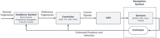 Unmanned Aerial Vehicles (UAVs) guidance, navigation, and control (GNC) rely heavily on the control algorithm. Actuator inputs required to produce moments and forces in accordance with guidance system commands are handled by the control system, which is comprised of control laws that take into account the current state of the UAV as determined by the navigation system (sensors) and the UAV dynamics. Maintaining stability and controllability of the UAV in the presence of exogenous inputs and wind disturbances is in the hands of the control algorithm. An unmanned aerial vehicle’s trajectory is maintained via a control command calculated from the UAV’s current state and the pre-planned trajectory. The ultimate objective of UAVs is to perform the required missions with minimal human assistance. Fully autonomous control of UAVs is more challenging because it does not require human support during autonomous operation. As a result, problems with flight safety and accidents are more likely to occur in unmanned aircraft compared to planes flown by humans [20]. Creating and implementing sophisticated and reliable control algorithms is crucial for preventing these failures and enhancing autonomy. Numerous control algorithms, from the more basic PID [21] controller to the more complex Neural network and fuzzy logic controllers [22], have been developed and implemented for the autonomous flight of UAVs.