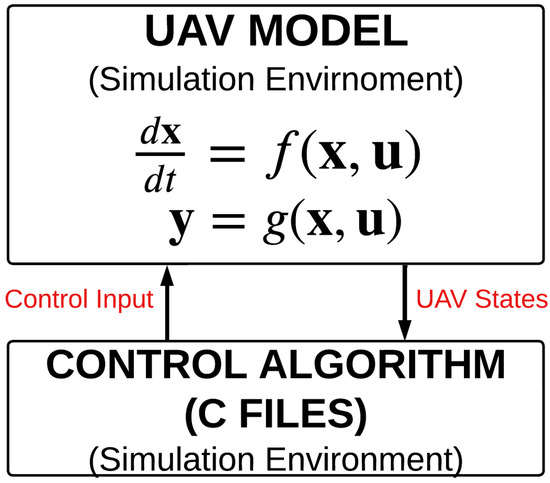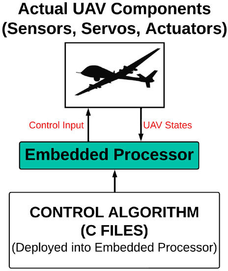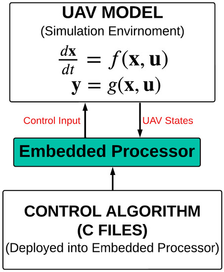 After achieving desirable results in MILS, the next step is to transition to Software-in-the-Loop simulation (SILS). Instead of using a controller model, SILS relies on the C-code of the controller block as depicted in Figure 4. The plant model is unaltered (same as MILS) whereas the controller model is emulated in C code for SILS. SIL simulation is typically performed to mimic the behavior of the embedded processor on which the developed algorithm will eventually be deployed. SILS’s main objective is to check whether the designed algorithm is software implementable or not? In this regard, Mathisen et al. [90] used a non-linear MPC controller to achieve a precision deep-stall landing of a fixed-wing UAV, and then validated the controller’s performance with Software-in-the-Loop simulations. Authors of [37,127,128] used SILS to validate their designed algorithms.