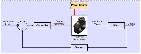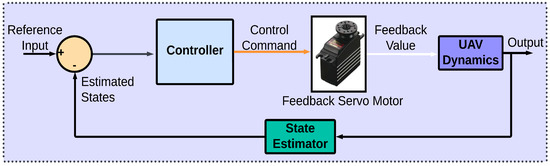 Hardware-in-the-loop simulation comes after PILS has been effectively implemented. Incorporating some physical components of the actual plant into the simulation loop is the basic idea behind HILS. Actual plant hardware (servos, actuators) is employed in the simulation loop instead of a mathematical model of the plant to verify the control algorithm [131]. An example of adding a feedback servo motor in the feedback control loop of a plant during HIL simulation is shown in Figure 6. HIL simulation can be utilized to assess and verify the integration of a system’s software and hardware. This can assist in identifying potential issues like different noises in the sensors and synchronization issues between the components. Figure 7 depicts the HILS system’s fundamental block diagram. The autonomous takeoff and landing of a UAV were simulated using Hardware-in-the-Loop by Carnes [21]. Johnson et al. [132] utilized SILS and HILS for the verification of both hardware and software changes before the flight and after gain adjustments for system performance verification. Similarly, authors of [96,97,127,128,133,134] also performed HIL simulations.