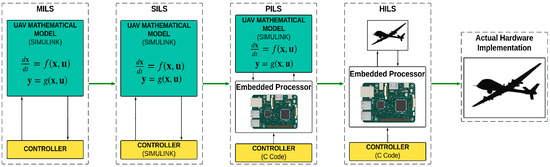 Processor-in-the-Loop simulations (PILS) follow SILS. Similar to SILS, PILS involves burning a controller model onto an embedded processor and then running a closed-loop simulation of the simulated plant. Figure 5 depicts the PILS setup, with the controller model code executing on hardware and plant operating in a simulated environment. PIL simulation is an effective tool for system design and development that permits engineers to assess and improve both the software as well as the hardware aspects of a system. When testing whether a processor can reliably run the controller code without errors or delays, PILS simulations prove invaluable. In this regard, You et al. [108] confirmed the controller’s effectiveness during the take-off and landing of a fixed-wing UAV. Likewise, Ulker et al. [129] conducted PILS for a fixed-wing UAV in windy conditions in various flight scenarios, including straight-and-level flight, level climb, and turn. Similarly, authors of [130] used PILS to validate their flight control algorithm and microcontroller’s performance.