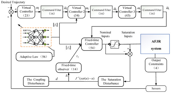 In terms of dealing with unknown dynamics in nonlinear systems, neural network-based control is an effective solution. In [14], an adaptive neural control method for electrically driven FJRs was studied, applying radial basis function neural networks (RBFNNs) to approximate the unknown nonlinearity of the system. In [15], an adaptive neural network control based on integral Lyapunov functions was proposed for task tracking under the uncertainty of the FJR. In [16], nonlinear functions were approximated by using neural networks (NN). The authors of [17] proposed an observer-based RBFNN to estimate the state variables of a normal system. Most of the above NN-based schemes were carried out in the backstepping framework. However, the computing explosion problem is unavoidable for repeated differentiation of virtual control. To solve this issue, a command filtering method was used in [18,19,20]. To eliminate the effect of filtering errors, instruction filtering compensation strategies were proposed in [21,22]. Inspired by the above analysis, this paper intends to investigate fixed-time stable neural network control schemes to solve the fast-stability problem of FJR systems when considering the complexity explosion problem and filtering disturbances.