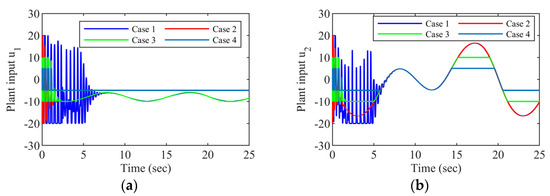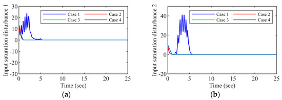 Figure 5 shows the control inputs. All the plant inputs satisfy . Figure 6 shows the outputs of the fixed-time observer, which represents the estimation of the saturation disturbances. We can see that when the actuators are out of saturation, the state variables of the fixed-time observer can converge to zero quickly, thus restoring the system performance under the nominal controller. Therefore, we can conclude that the control scheme proposed in this paper can realize the tracking control of the FJR under different input saturations. The solution with filtered compensation is more effective than the one without compensation.