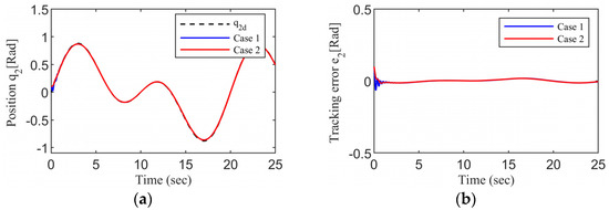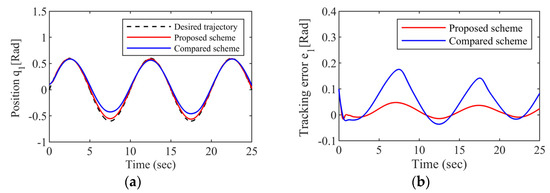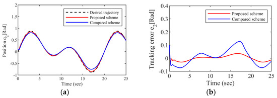 The comparative simulations are performed with the same control parameters and the initial state of the system. The simulation results are shown in Figure 7, Figure 8 and Figure 9. Figure 7 and Figure 8 represent the tracking performance of joint 1 and joint 2, respectively. We can see that the tracking effect using the comparison scheme is not satisfactory where the expected trajectory changes more frequently. The system has a large overshoot, and when the system is in a steady state, the error fluctuation is still large, close to about 0.2 rad. On the contrary, the convergence performance of the error is faster using the FTOAC scheme proposed in this paper, and the errors stay in a very small range when the system is stable. Table 4 shows the mean value and root mean square of the tracking errors. It is obvious that the mean and root mean square values of the tracking error of the FTOAC are smaller.