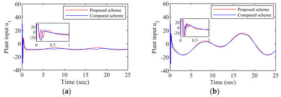 Figure 9 shows the actual control input of the system. By the FTOAC, the control input curve is smoother. According to the above analysis, it is clear that the control performance of the FTOAC scheme is much better than the compared scheme.