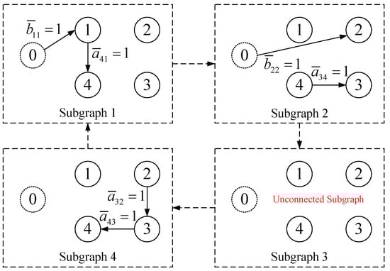 The simulations are carried out in Matlab/Simulink. A group of four aircrafts (i.e., ) is considered herein as an illustrative example, and the control approach is applicable to formations of a larger number of aircraft. The switching communication topology among the aircraft and the reference system is what is specified in Figure 1. The subgraph switching sequence starts from Subgraph 1, and the “dwell time” for each subgraph is 2 s. After the dwell time, the subgraph switches from one to another. Moreover, the subgraph sequence is in a loop manner, and the period of the sequence loop is 8 s. The initial conditions for each aircraft are: