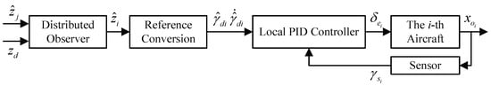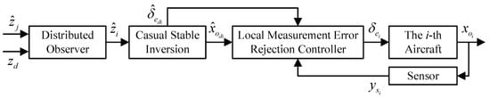 In this paper, a three-module control scheme is proposed for i-th aircraft shown in Figure 2. Specifically, by using the available information and from the reference system (17) and its neighbors, the Distributed Observer of i-th aircraft generates the estimate of , denoted by , from which the Casual Stable Inversion calculates the feedforward control term and the state reference expressed in the original coordinate system (1) for the controller. Then, the Local Measurement Error Rejection Controller generates the elevator deflection control command that achieves robust trajectory tracking of the reference using noisy output feedback signal obtained from the sensors. The design of each module will be detailed in what follows.