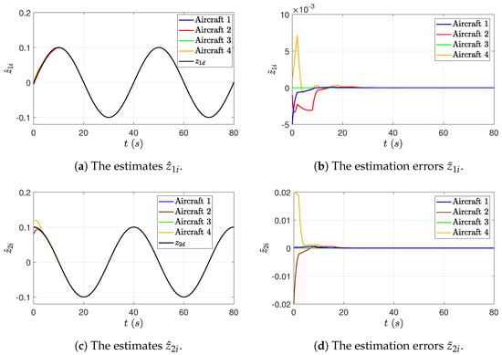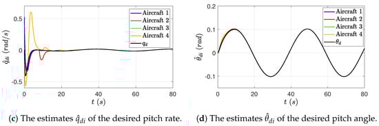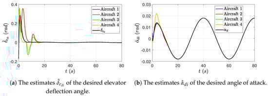 As shown in Figure 4, the Distributed Observer of each aircraft generates asymptotic estimates of the states of the reference system (17) under a switching and occasionally disconnected communication topology. With these estimated reference system states, the Casual Stable Inversion is able to first calculate bounded estimates of the desired input and state in the new coordinate, and then use the inverse coordinate transformation (36) to generate the bounded estimates of the desired input and state in the original coordinate, as shown in Figure 5. These simulation results validate Lemmas 1–3, that is, the estimates of the desired input and states (the colored curves in Figure 5) converge asymptotically to the desired input and states generated by the reference system (the black curves in Figure 5), and thus, the estimation of reference signals is achieved by the proposed Distributed Observer and Casual Stable Inversion equipped on each aircraft.