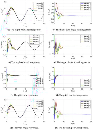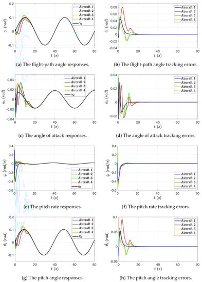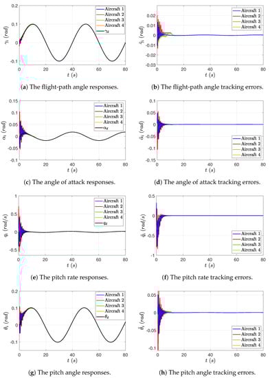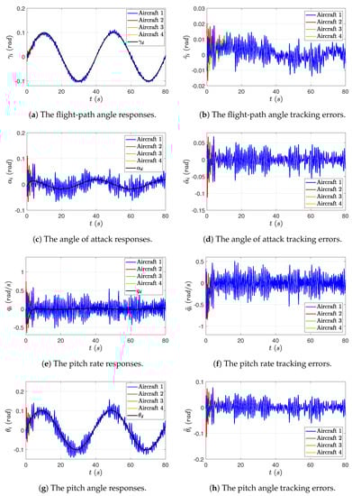 The state responses and tracking errors of each aircraft for Case 1 are shown in Figure 6 and Figure 7, from which it is seen that all the states are bounded, i.e., the objective (21) is achieved. Moreover, for the objectives (19) and (20), the proposed control delivers asymptotic tracking of the desired flight-path angle in the absence of measurement errors, and delivers approximate tracking with very small ultimate bounds rad in the presence of measurement errors, thanks to the proposed Local Measurement Error Rejection Controller that actively estimates and compensates for the measurement errors.