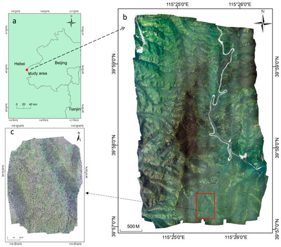 The study area is located in Dongling Mountain (Figure 1a), Mentougou District, Beijing, China (115°26′–115°30′ E, 40°00′–40°02′ N). The area belongs to the remnants of the Little Wutai Mountains in the Taihang Mountains, with an elevation range of 400–2303 m and an average elevation of 1100 m [34]. The area has a warm-temperate continental monsoon climate with four distinct seasons, cold and dry winters, and warm and humid summers [35]. The average annual temperature in the region is in the range of 2–8 °C, and the annual ≥ 0° accumulation temperature is in the range of 3600–3800 °C; the annual precipitation is concentrated in summer, with an average annual precipitation of approximately 600 mm and in the range of 300–400 mm from June to August; and the frost-free period is less than 160 days [6]. The terrain is dominated by the mountain erosion structure type, and the soil type is mainly brown loam [4].