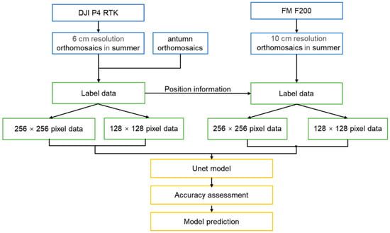 The workflow of this paper is shown in Figure 2. First, we obtained accurate reference data using multi-rotor UAV images and multi-seasonal features of vegetation for visual interpretation and combined them with convolutional neural networks to construct a high-precision classification model. Second, we use the high-precision prediction ability of the multi-rotor classification model and the visual interpretation method to expand the sample data and make a sample set using the location information with fixed-wing UAV images, the U-Net model is then used to train the model on the sample set of fixed-wing UAV images and to perform large-area tree prediction.