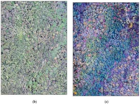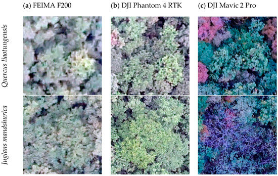 Examples of classified tree species on different UAV imagery: (a) Image data acquired by Feima F200 in August. (b) Image data acquired by DJI Phantom 4 RTK in July. (c) Image data acquired by DJI Mavic 2 Pro in October.