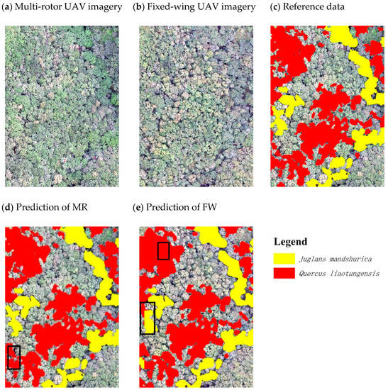 Prediction of UAV images using trained models: (a) Multi-rotor UAV RGB imagery. (b) Fixed-wing UAV RGB imagery. (c) Reference data. (d) Prediction map of multi-rotor UAV imagery model. (e) Prediction map of the fixed-wing UAV imagery model. MR and FW represent multi-rotor UAV imagery model and fixed-wing UAV imagery model, respectively. The black rectangle represents incorrect classification results.