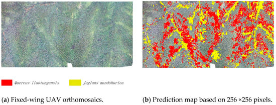 We selected an area of 120 ha on the fixed-wing UAV image as the scene for model prediction (Figure 7). We used the 256 × 256 pixels model with the highest model accuracy to predict the scenes. Overall, the prediction ability of the model was effective, and the model was able to make accurate predictions for Juglans mandshurica, but the prediction for the fragmented Quercus wutaishanica was general.