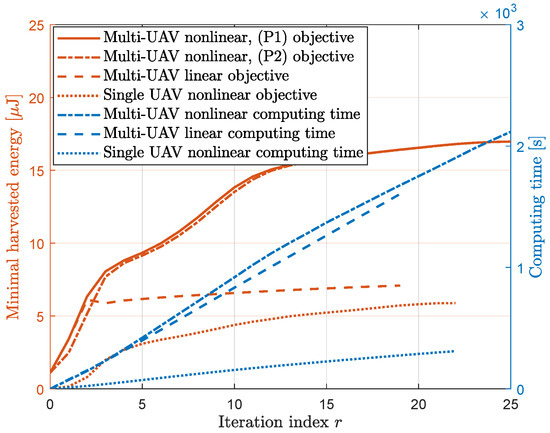 Figure 3 to validate the convergence of Algorithm 1 and to compare it with the benchmarks, where the currently optimized objectives of both problems (P1) and (P2) of the proposed algorithm with the multi-source nonlinear EH model, the objective with the simplified linear EH model and the objective with the single UAV with nonlinear EH model, as well as their computing times after each iteration, are provided. Note that the objective of the linear EH model is calculated by substituting the optimized trajectory and transmit power with the linear EH model into the nonlinear EH model, such that the harvested energies of the two schemes can be compared. From this figure, it can be found that the objective of problem (P1) remains larger than that of (P2), especially in the first few iterations. The reason is that the objective of (P2) is the lower-bound function of (P1), such that it remains equal to (P1) before each iteration but becomes smaller than (P1) after each iteration, as shown in the convergence analysis (