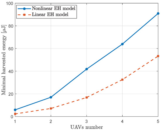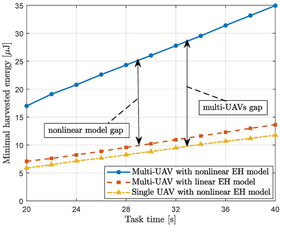 Figure 4. We can see the monotonously increasing tendency of the minimal harvested energy for the three schemes with the addition of the task time duration, while there exist minimal harvested energy performance gaps from the proposed scheme to the multi-UAV with linear EH model (denoted as nonlinear model gaps) and to the single UAV with nonlinear EH model (denoted as multi-UAV gaps). Specifically, the longer the task time is, the larger the two gaps are, which validates the performance advantages of the proposed scheme and demonstrates the necessity of considering the practical nonlinear EH model. Additionally, while increasing the UAV number from 1 to 2, a two-times performance enhancement is observed. It can be explained by the fact that the energy harvested while the UAVs fly around the GDs is greater than the energy harvested while the UAVs fly towards the GDs, even with the same duration, such that deploying multi-UAV can lead to improvements in the minimal harvested energy.