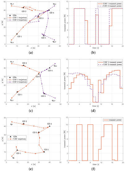 Figure 6. The discrete point aggregation around GDs can be observed in both multi-UAV schemes, which means that the UAVs prefer to hover around the GDs to acquire a better channel power gain with a sufficient task time. In addition, the trajectories optimized by the proposed scheme show a more complicated and space-coupled characteristic, while an obvious smooth and space-decoupled behavior can be observed for the trajectories with the linear EH model. Note that the space-coupled trajectories with the nonlinear EH model do not mean that the two UAVs will collide with each other, as they are separated from each other in the time domain, but it means a tighter connection between the two UAVs, which will bring about better performance. Furthermore, comparing the transmit power of the two schemes with the nonlinear EH model to that with the linear EH model, better transmit power utilization efficiency can be seen with the nonlinear EH model, where the UAVs reduce the transmit power when they are far from the GDs and enhance the transmit power when they are around the GDs as much as possible. At the same time, the transmit power with the nonlinear EH model does not strictly follow such a suggestion, which is another reason for the performance loss.