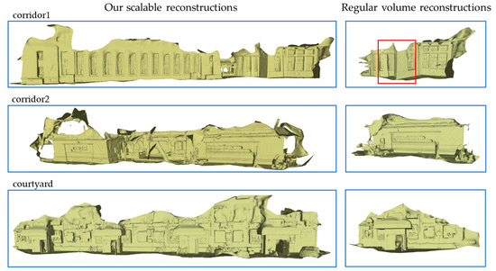 To evaluate the scalability of our proposed method, we compared its ability to reconstruct long RGB-D sequences with regular volume reconstruction approaches. Figure 5 presents and compares the reconstruction outcomes of both methods on real-world scenes captured by our MAV. The sequences’ ground length exceeded 30 m, with corridor 1 and courtyard exceeding 50 m. Our proposed method produced complete reconstructions of the entire sequences in all three scenes, while the comparison method only provided partial reconstructions. This limitation stemmed from the regular volume surface reconstruction approach’s need to predefine the reconstruction range before surface reconstruction, as well as the limited GPU memory available in airborne computing devices, which resulted in a much smaller maximum reconstruction range than that of base stations. However, our approach did not require such presetting of the reconstruction range and enabled timely data exchange between the GPU and host via the adopted bi-directional GPU–Host data exchange approach, thus freeing up space for subsequent surface reconstruction. Additionally, the random optimization pose estimation in regular volume reconstruction experienced a decline in precision when the camera approached the edge of the predefined reconstruction boundaries, leading to reconstruction misalignment, as demonstrated by the red box in Figure 5.