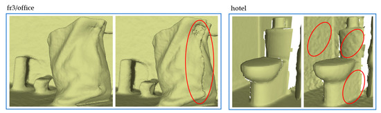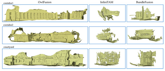 Due to the almost complete lack of loops in our dataset, which is a problem that robots must face directly in their actual applications, and our desire not to complete too much redundant work, even though both comparative methods have re-localization modules, it is difficult to recover reconstruction after losing tracking. Additionally, the aggressive camera motion results in severe image motion blur, making the loop closure of BundleFusion, which depends on color information, not work well. Although InfiniTAM successfully detects loops using depth images, it still cannot correct the significant accumulation error caused by fast camera motion. In contrast to these frame-to-frame pose estimation methods, our motion tracking uses a frame-to-model method, which has higher robustness and accuracy [2,56]. This makes our system much less prone to drift in fast motion at the same distance than some frame-to-frame methods, as shown in Table 5 and Table 6. However, the accuracy of the frame-to-model pose estimation method depends on an accurate model, which forces us to pay more attention to the surface quality of reconstruction. Despite this, significant drift still occurs in the reconstruction of extremely long-distance scenes.