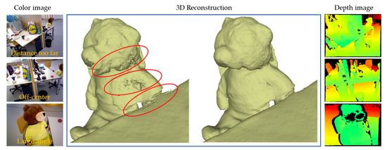 To validate whether the imaging and scan validity weighting introduced is useful in reducing sensor noise in deep fusion, we compared the reconstruction details of two methods, one with weighting and the other without. Figure 6 depicts the partial reconstruction details of two publicly available datasets. Our approach measures the observation validity in the deep fusion, thus obtaining high-quality denoising modeling from defective data. In an extreme case, as shown in Figure 7, there is a defect in scanning the left part of the teddy bear, causing significant noise on the reconstructed surface (as indicated by the red circle). On the contrary, our weighted fusion method demonstrated better modeling performance.
