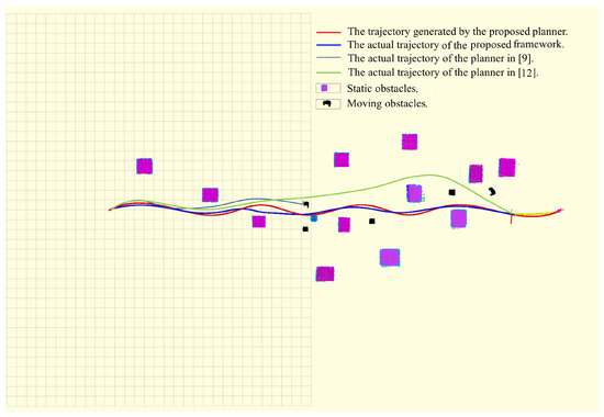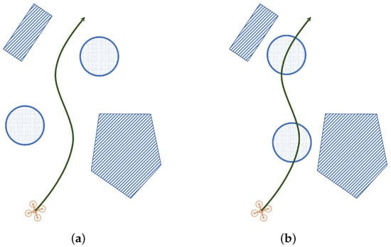 Furthermore, some local planners concerning a dynamic environment have been proposed recently. The vision-based dynamic environment motion planning of quadrotors by online replanning was realized in [19], but the framework for avoidance was limited by the frequency of the planner. The EB-RRT local planner, proposed in [20], performed real-time optimal motion planning for a mobile robot in a dynamic environment by combining the elastic band and RRT. The work improved the planner but presented more expensive computational complexities. As shown in Figure 1, a lightweight and reactive method is more applicable for safety when there is a moving obstacle blocking the origin trajectory. The UAV should have the ability to avoid obstacles whilst tracking the origin trajectory.