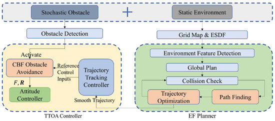 The goal of this work is to address a UAV’s autonomous navigation in typical surroundings. We proposed a framework for planning and controlling a quadrotor UAV to achieve both target arrival and obstacle avoidance. The schematic diagram of the planning and control method flow is presented in Figure 2. Firstly, it is necessary to classify the detected continuous frames of point clouds into two classes, dynamic and static. The static point clouds are built as a map, while the dynamic point clouds are removed and used as the input for the trajectory tracking and obstacle avoidance (TTOA) controller after position and velocity estimation. Second, both the front- and back-end of the suggested EF planner have seen significant development. Path finding only focuses on a few key points that are boundary and corner points of the point cloud map. The back-end generates a B-spline curve based on the path and optimizes the trajectory by using the convex hull property. Finally, the TTOA controller is designed including trajectory tracking control and obstacle avoidance control based on the CBF. The TTOA controller can track the planned trajectory and avoid moving obstacles.