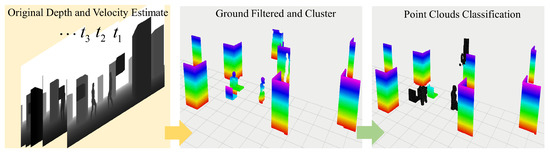 A requirement for the motion planning and control of the UAV is the perception of obstacles. Obstacles in the real world can be both moving and static. We use DBSCAN [26] and the voting of an individual point to classify obstacles based on several continuous frames of the point cloud [27]. The overall process is shown in Figure 3. First, the average velocity of each point cloud is calculated after ground filtering and down-sampling. Then the velocity of each point cloud cluster is obtained by Equation (1), where is the velocity of obstacle, t is time, and represent the position in current and previous frame, respectively, n is the number of points contained in the cluster, and represents the time interval between two frames. When the point cloud velocity is greater than (0.3 m· s), the object is categorized as a dynamic object because the UAV is already at risk from it. Furthermore, if a point’s velocity exceeds , the point will vote for it to be dynamic. The obstacle will be recognized as a dynamic obstacle if the ratio of dynamic votes over valid points is higher than another threshold , represented in (2). Finally, two classifications of dynamic and static obstacles are obtained.