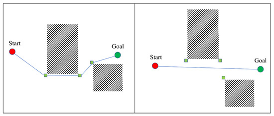 The planner processes the static point cloud following the aforementioned classifications, while the controller handles the dynamic point cloud due to its temporal variability. The obstacle space is much smaller than the free space, so our work just focuses on the key points of static environments in path searching. Inspired by time elastic bands (TEB) [28,29] and jump point search (JPS) [30,31], a new front-end local planning approach is proposed. Similar to the elastic band, Figure 3 shows that the path stretches into a straight line when there are no obstacles between the starting point and the target. The elastic band will always go around some obstacle corners when the start point and target are blocked. Therefore, the planner includes two parts, the extraction of environmental feature points and the design of a path planner based on these points. To efficiently identify the shortest path in a complex environment, the system must concentrate on the boundary feature points of obstacles. By constructing a graph based on these points, we can perform a graph search algorithm to find the optimal path Figure 4 and Figure 5.
